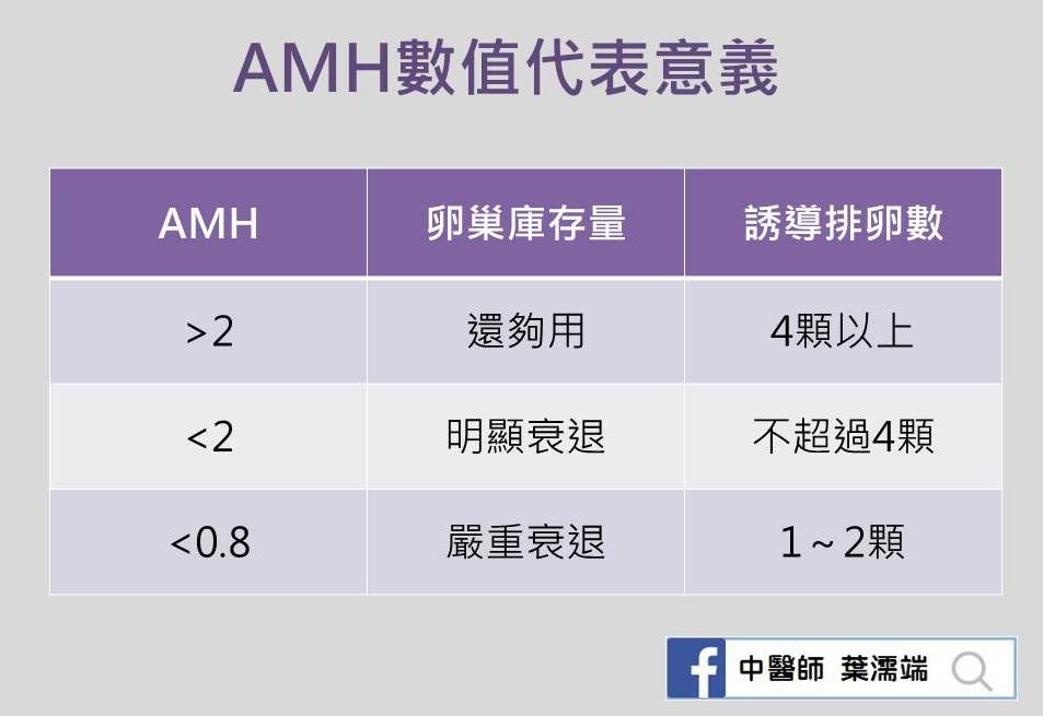 年輕女性一般AMH的數值約在2~4,<2代表卵巢功能已明顯衰退,若是到西醫的不孕門診藉由藥物或打針誘導排卵,誘發的卵泡數約在2~4顆,已明顯減少,相對懷孕機率就降低許多。